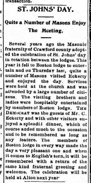 Boston Lodge No. 498 F. & A. M. held its meeting at Boston (present day Eckerty) in a room rented from Fred and Julia A. Weedman on lot 73 for twenty-five dollars per annum. In the book recorded December 6, 1873, a notation is written that Fred Weedman should be allowed the above sum for rent of the hall. The lodge was started by the following chartered members: