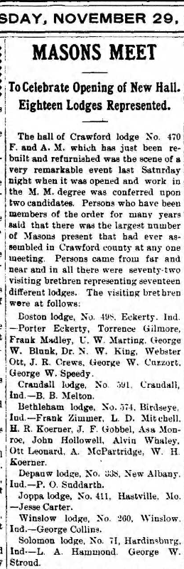 After getting their charter, a hall was built and used until 1903. The lodge was then placed above the bank building. In 1922, a new hall was completed. (*History of Crawford County Indiana – Pleasant)