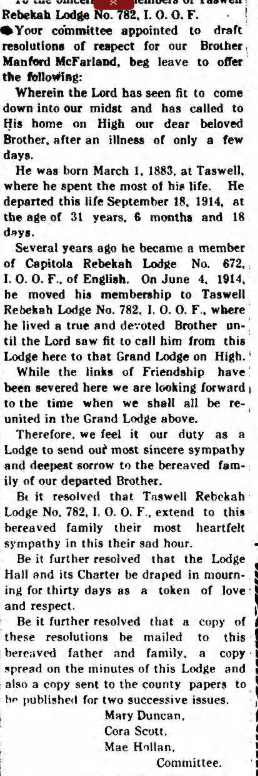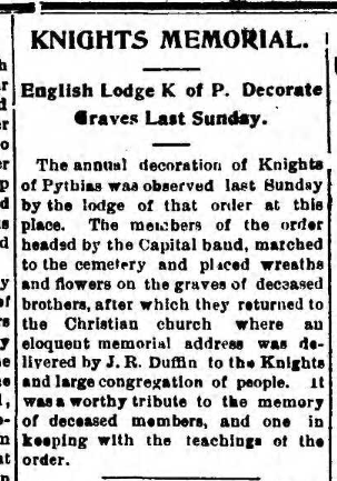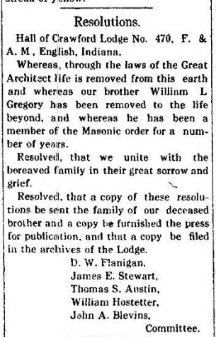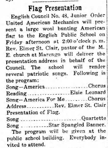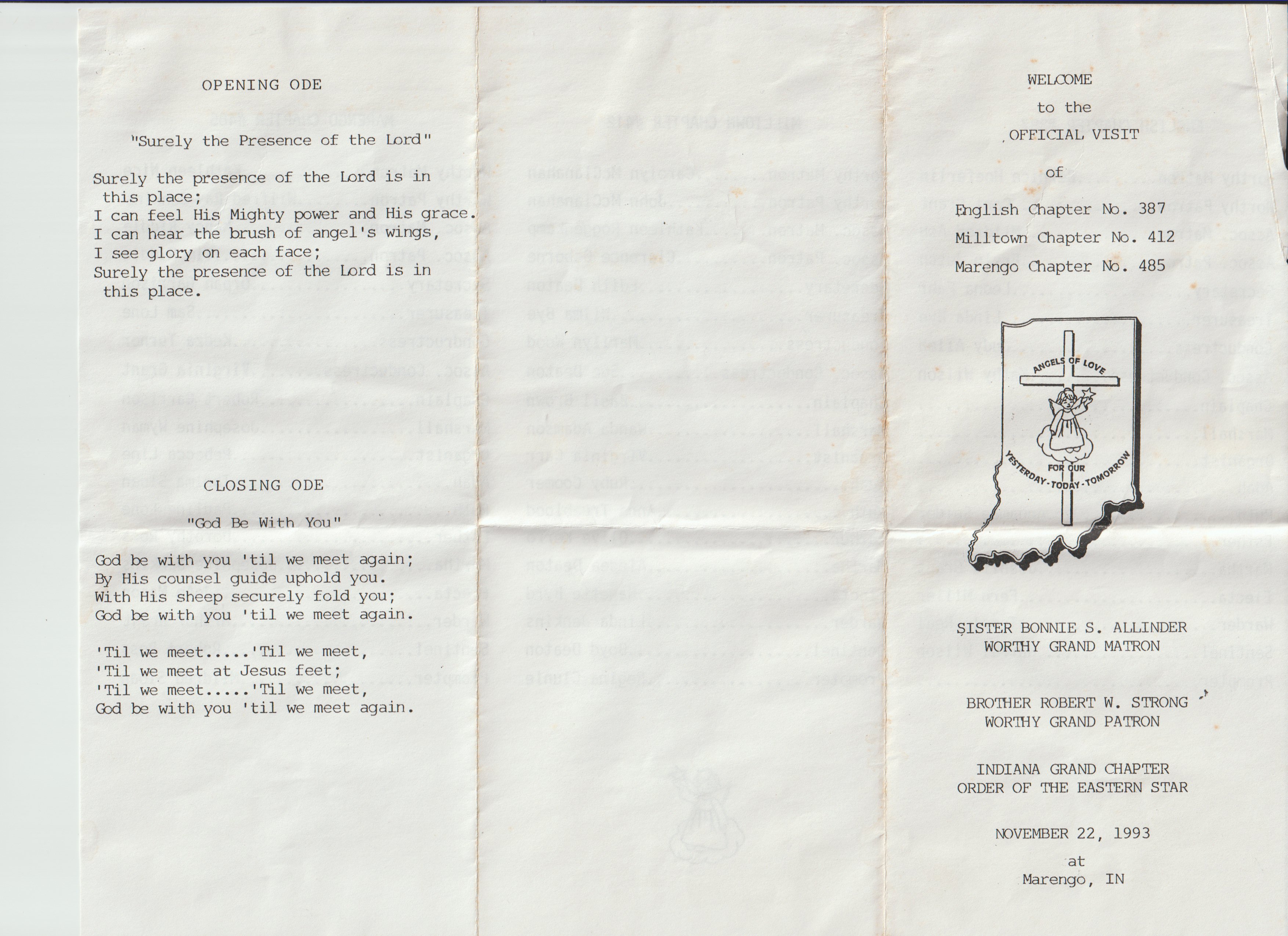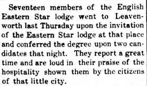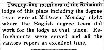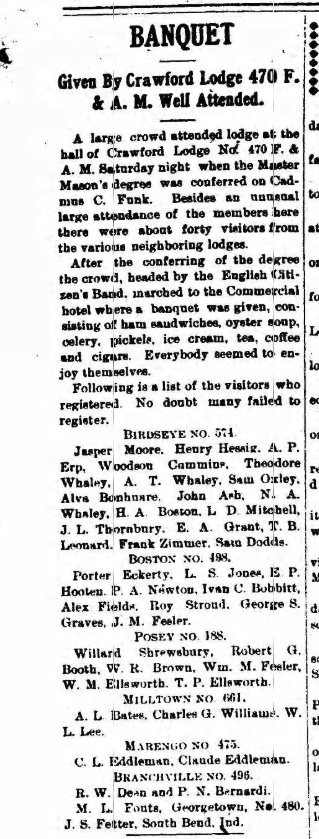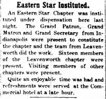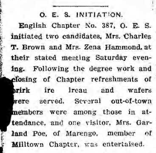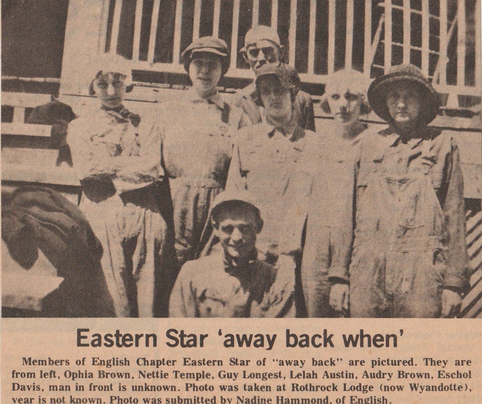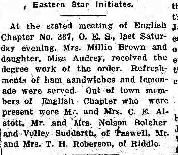 The Eastern Star Chapter was organized at English on July 24, 1913, with thirty charter members. The Leavenworth degree team, which consisted of Mr. and Mrs. T.P. Ellsworth, H.H. Deem, S.E. Grimes, D. Moyers, Hugh Friedley, C.T. Allen, William Fesler, Grace Houser, Lou Paxter, Lloyd Curts, Alice Sprinkle, Belle Alexander, Maude Robinson, Rella Rainforth, Margaret Booth, Delia Conrad and Esther Conrad came over from Leavenworth and conferred the degree. On the account of the train wreck, the Grand Matron and secretary did not arrive till about midnight. The refreshments were served at the Commercial Hotel about ten o’clock that night. The officers elected for the newly organized chapter were: Worthy Matron – Mrs. Joel Melton; Worthy Patron – Henry Mock; Associate Matron – Mrs. J.E. Stewart; Conductress – Mrs. Oliver Blevins; Secretary – Nell Thornbury; Treasurer – Mrs. Harrison Brown; Sentinel – George W. Cuzzort. (History of Crawford County Indiana – HH Pleasant)