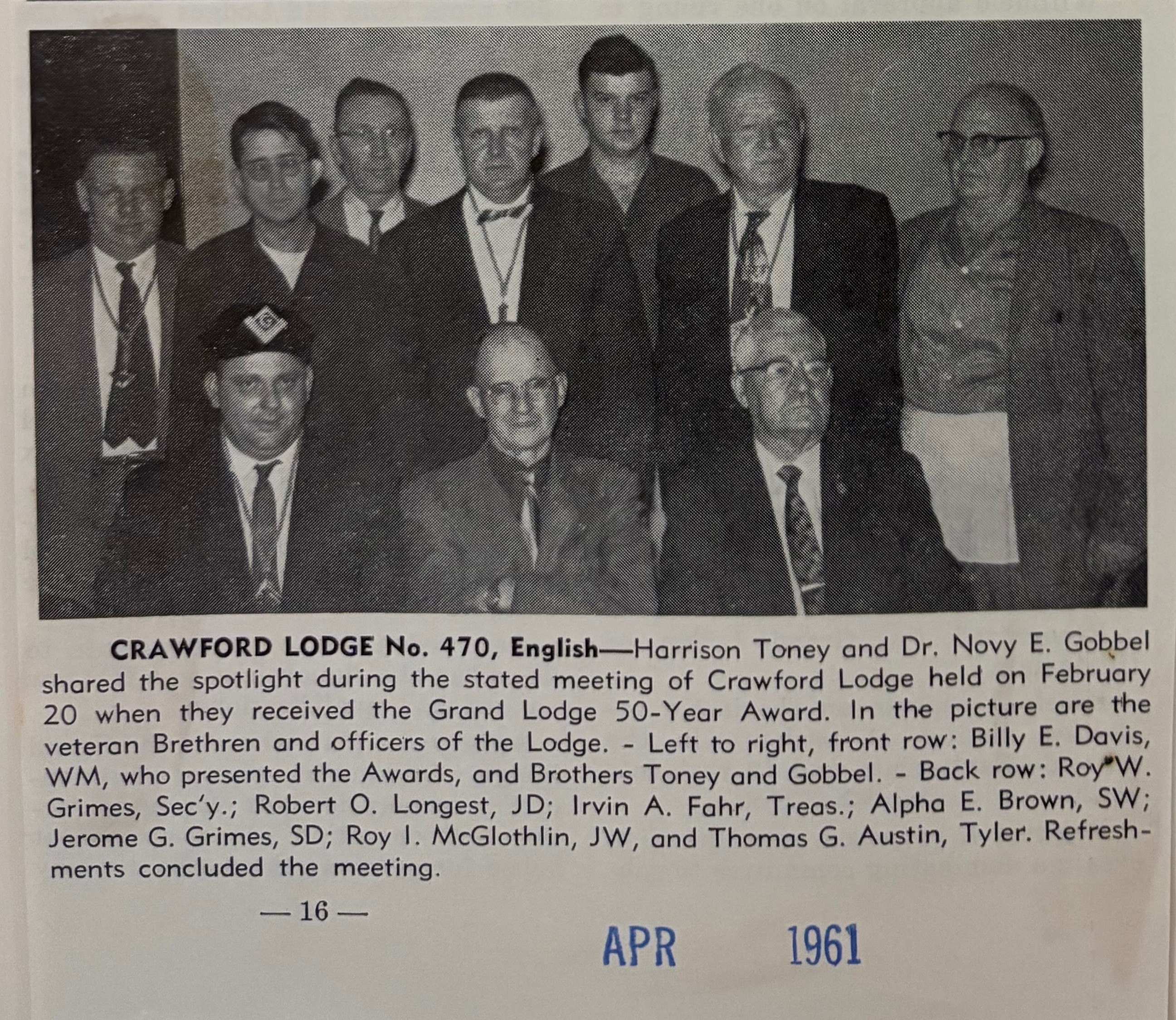 On April 19, 1929, a fire razed a two story building occupied by the C.J. Sams Motor Company and the Masonic lodge / Eastern Star chapter. (*Twentieth Century History of Crawford County – H.O. “Whitey” Jones)