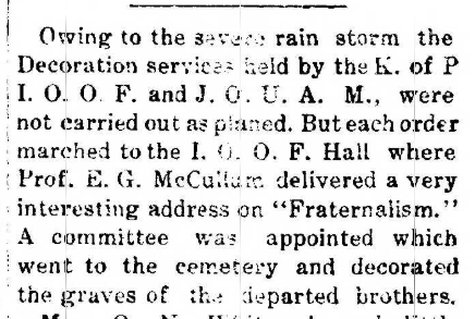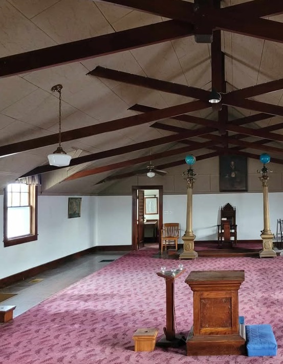 The lodge met in the Odd Fellows Hall until March 4, 1857, when they moved into another building that is not designated. In 1862, they moved to the Kendall building and in 1864 to the Mansfield building and thence to the Humphrey building in 1870. In 1883 they moved to the Oliver Whitcomb building. In 1889, this building was deemed not safe and the lodge moved to the M.C. Froman building and stayed there until the great fire of October 22, 1890. A building was rebuilt near the corner of Nelson and River streets, and the lodge stayed there until the flood of 1937. During 1937/38, the lodge held it’s meetings first in the room above Dr. Deen’s Store and then above Chester Elliott’s store and thence to the basement of the Presbyterian church on Campbell’s Hill. They eventually built the lodge on North First street, where they would remain until the lodge consolidated with Pisgah.