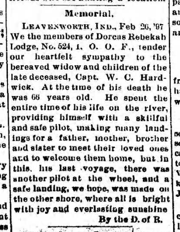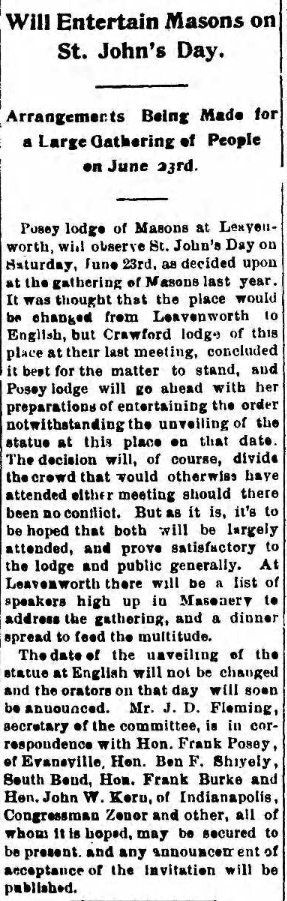 Posey Lodge #188 entertained Thursday night, April 15, 1921, the Crawford Lodge #470 of English with a grand fish fry. About forty of the members from English attended. Over two hundred pounds of fish were fried. The members were pleased with the entertainment. Joseph Bell secured the steamer Richard Rhea and took the visitors for a ride on the beautiful Ohio up as far as the new Government Dam # 44. After the return of the boat the Crawford lodge conferred the Master Mason degree upon Marsh Jenkins of Leavenworth. The English members were pleased to learn that Posey Lodge, which is the oldest lodge of Masons in the county, was in good condition financially. Besides the English members, many attended from Alton, Marengo and Milltown. (History of Crawford County Indiana – HH Pleasant)