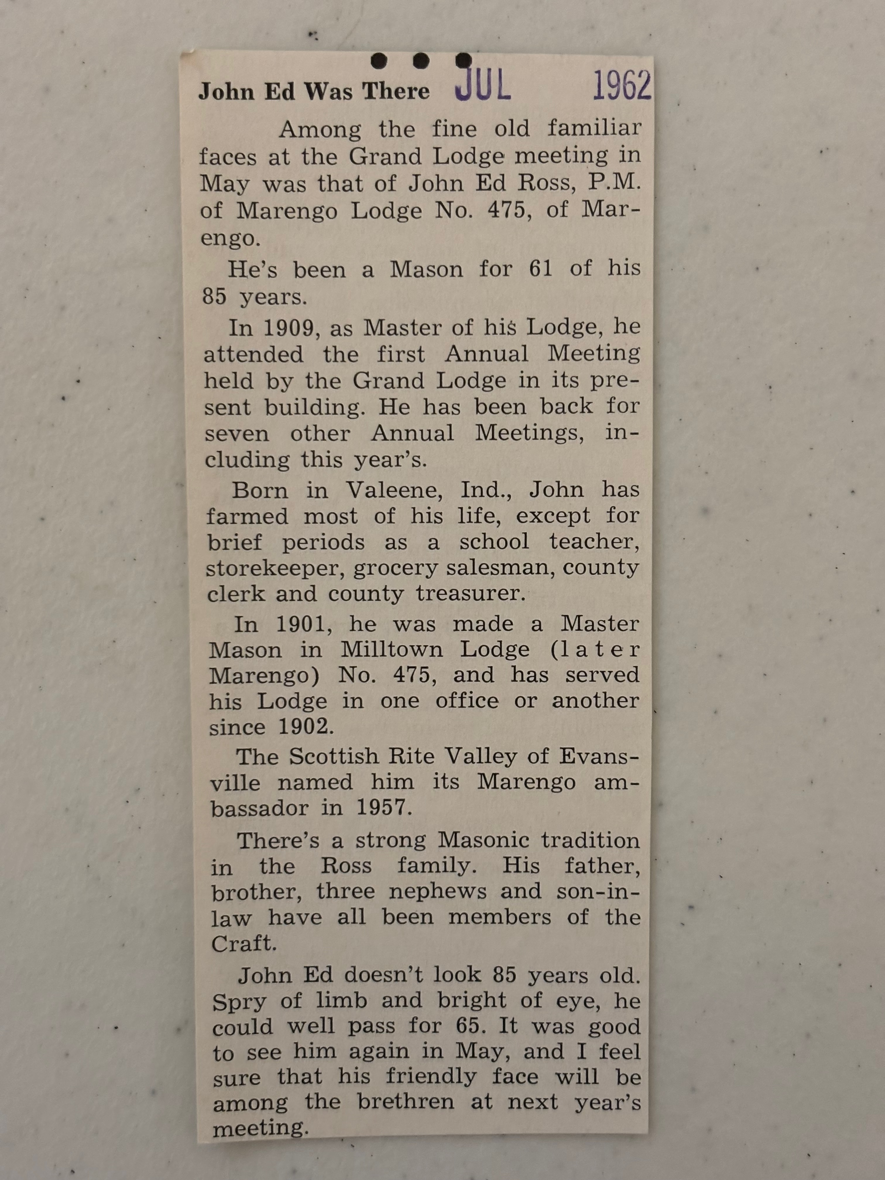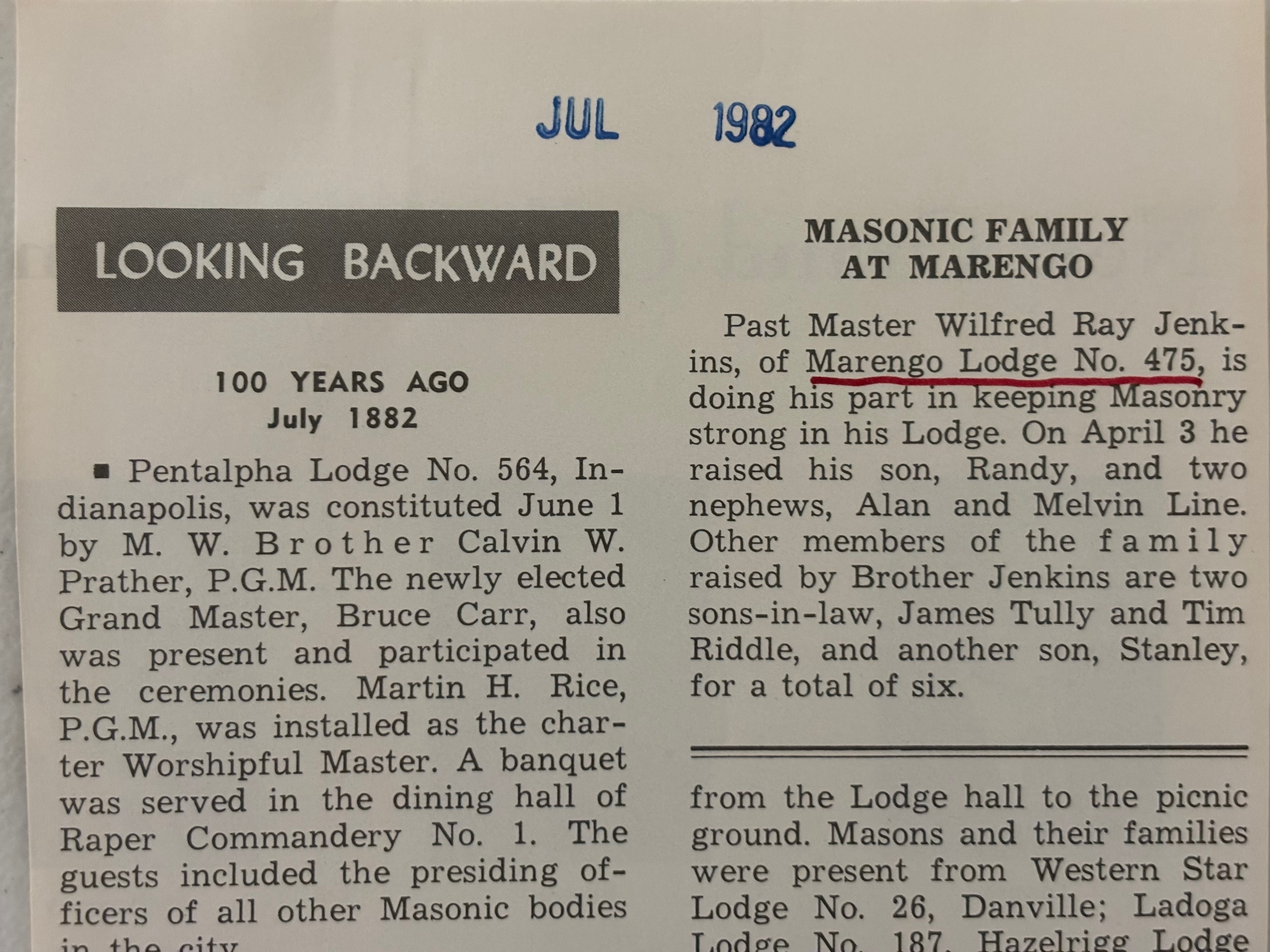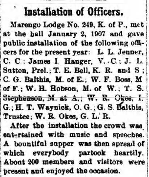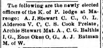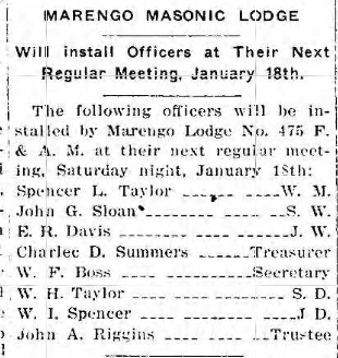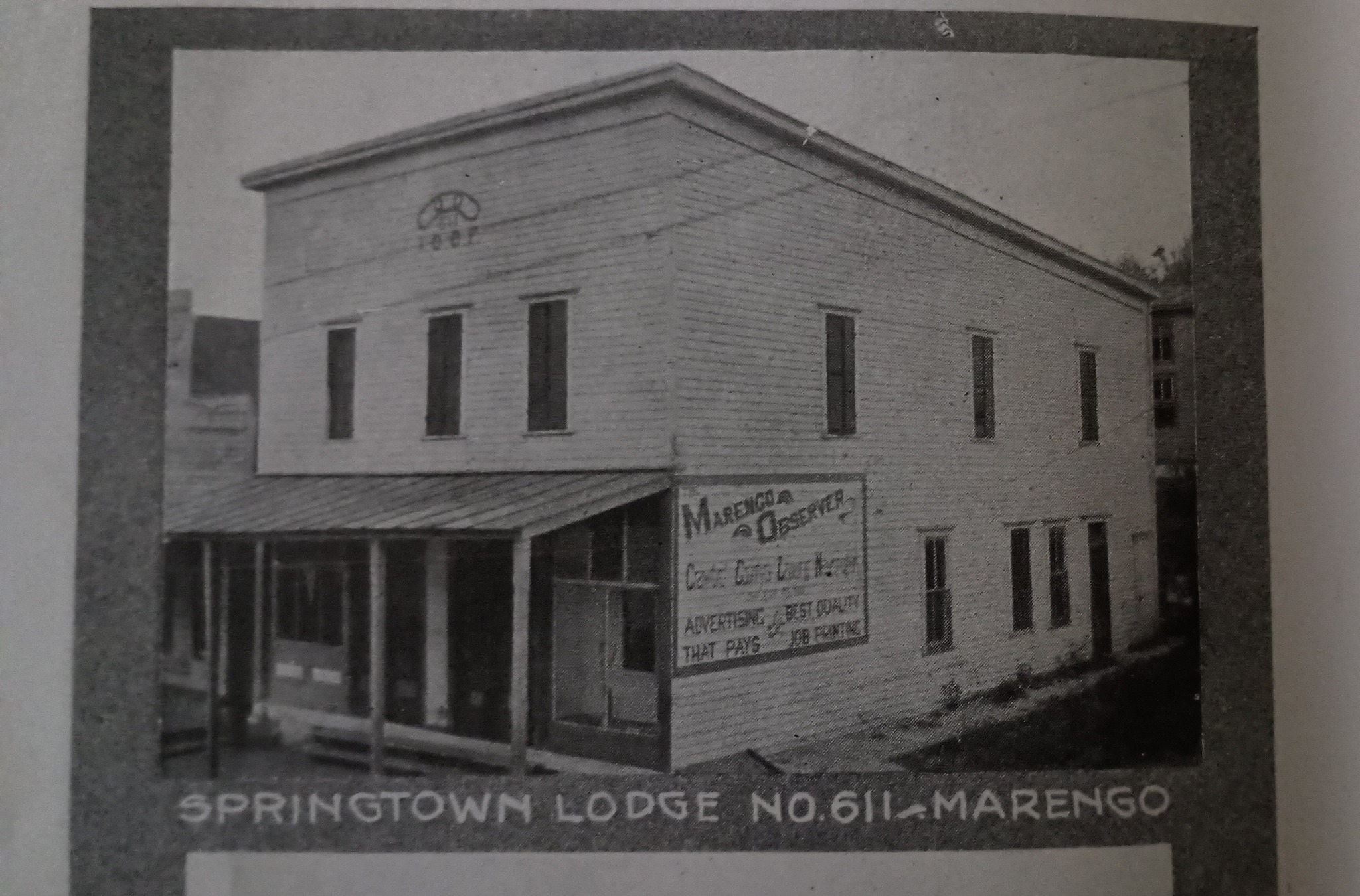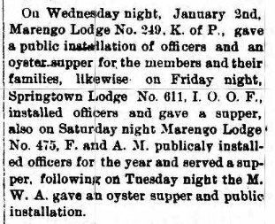 Charter originated in Milltown. The lodge met upstairs in the building on the corner at the head of Main Street. In 1884, the lodge sold the building to the Odd Fellows and moved the charter to Marengo. (“Milltown: A Community History” by Jeffrey Davis & William Brockman)