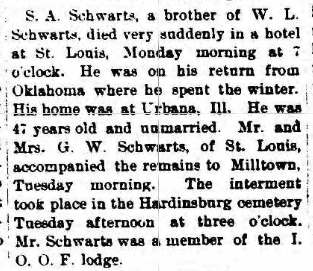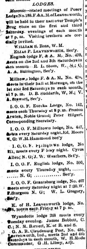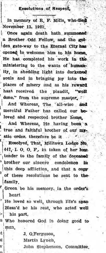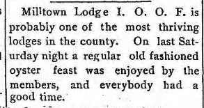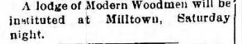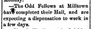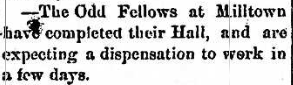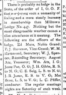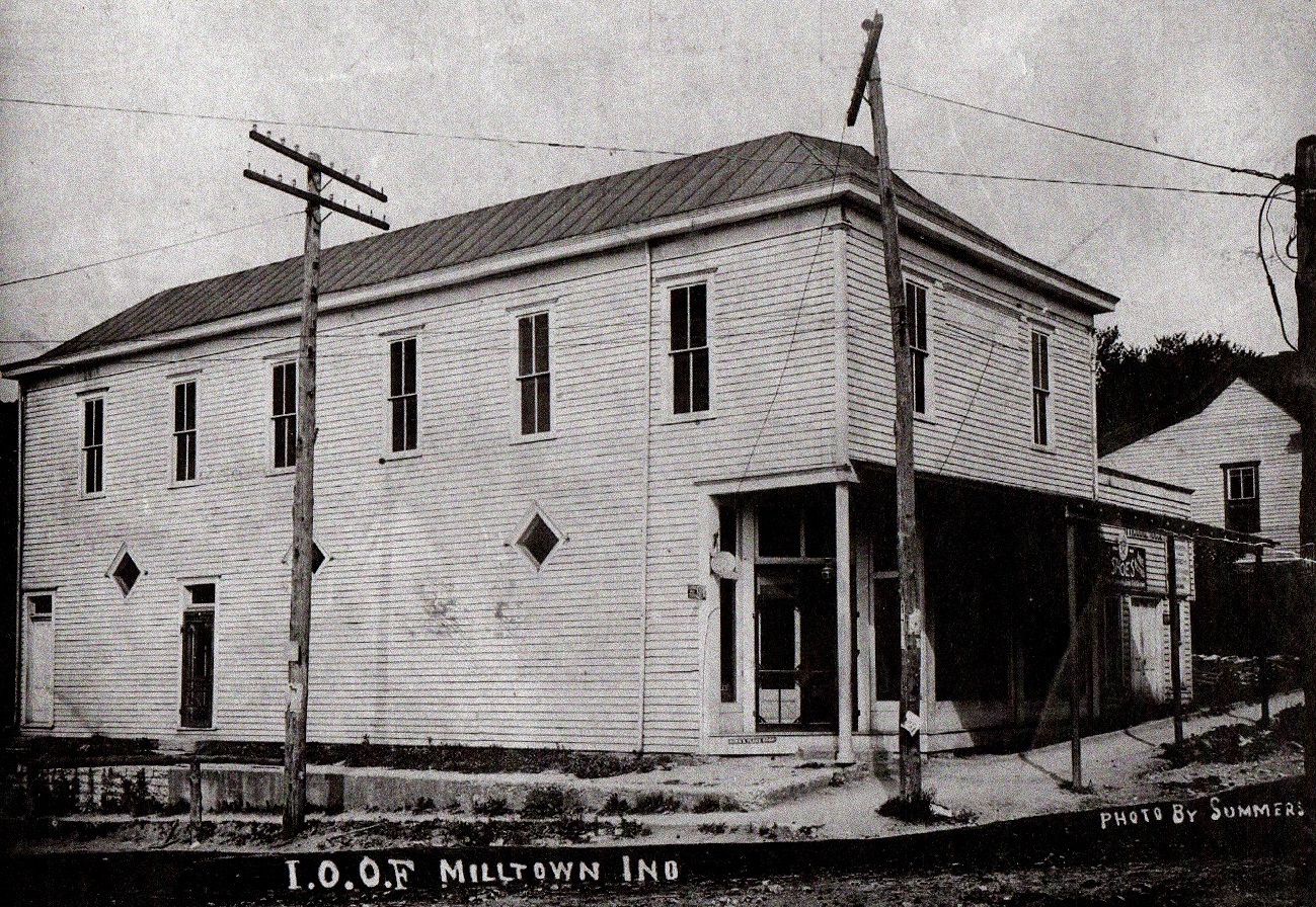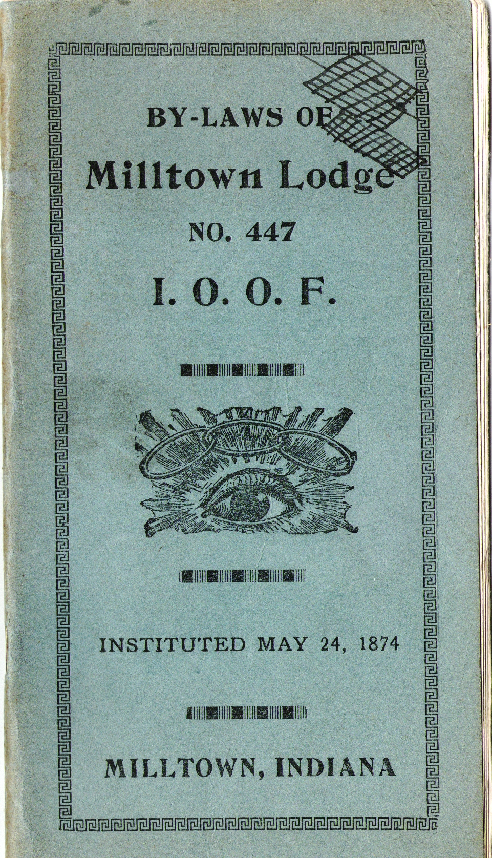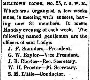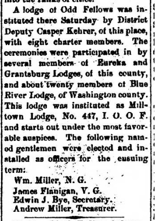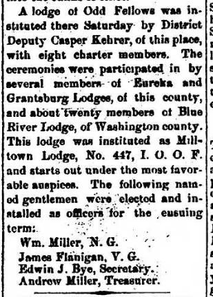 According to the Crawford County Democrat newspaper, April 16, 1874, an IOOF lodge was instituted at Milltown on Saturday, April 11, 1874 (which is different than the date from the by-laws book). The installed officers were Wm. Miller, N.G.; James Flanigan, V.G.; Edwin J. Bye, Secretary; and Andrew Miller, Treasurer.
