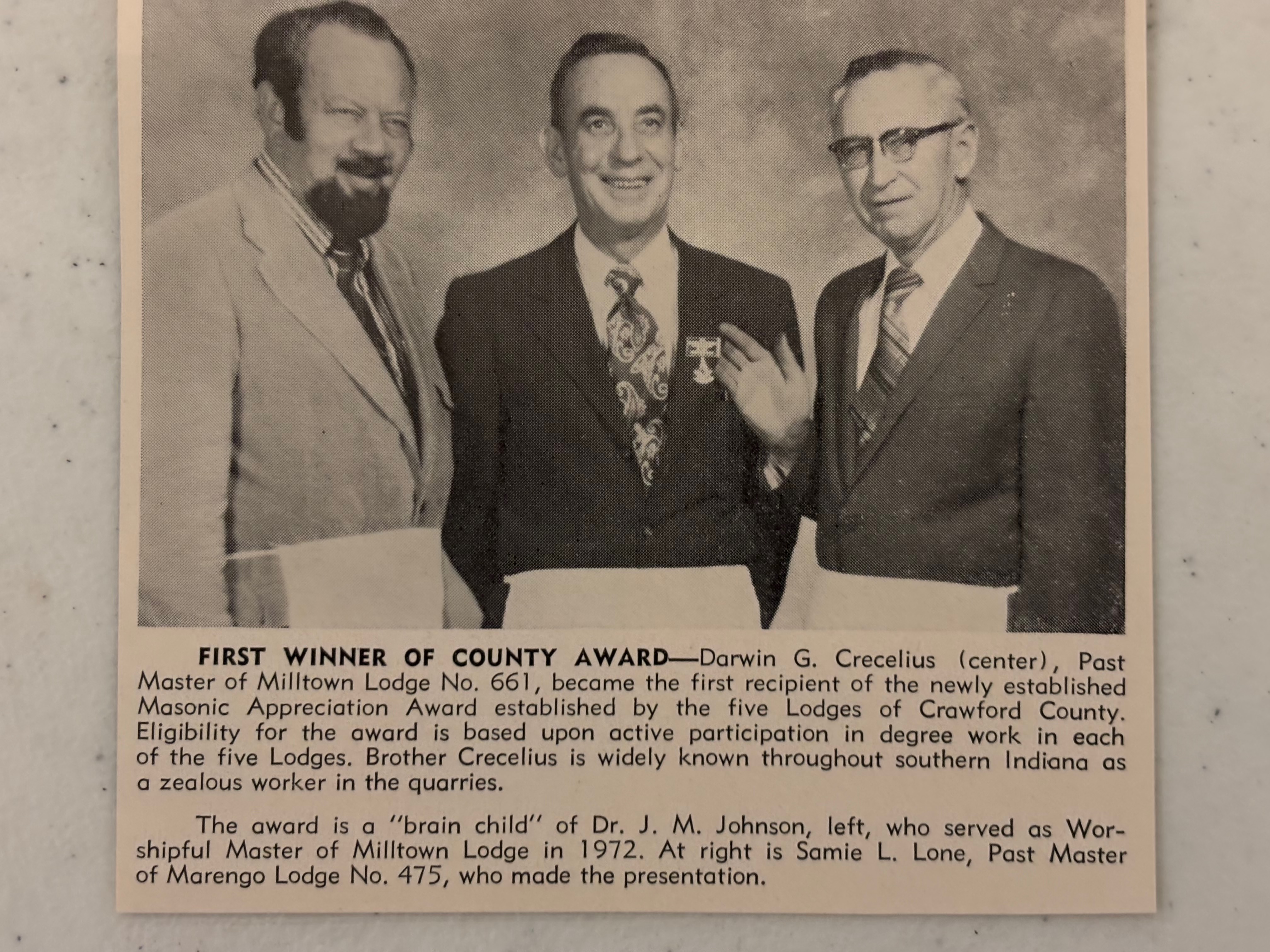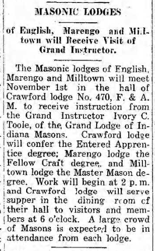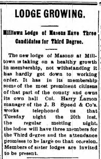 Second Masonic lodge to have started in Milltown (first one moved it’s charter to Marengo).