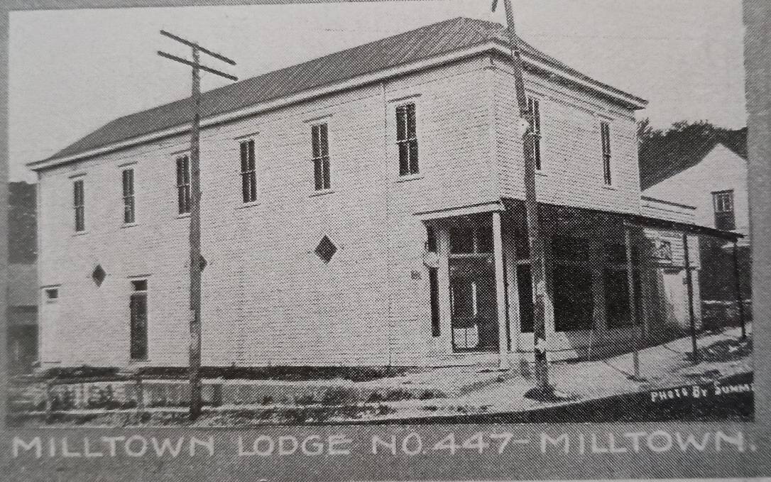 The lodge met upstairs in the building at the head of Main Street that had once been a school. (“Milltown – A Community History” – Jeffrey David & William Brockman)