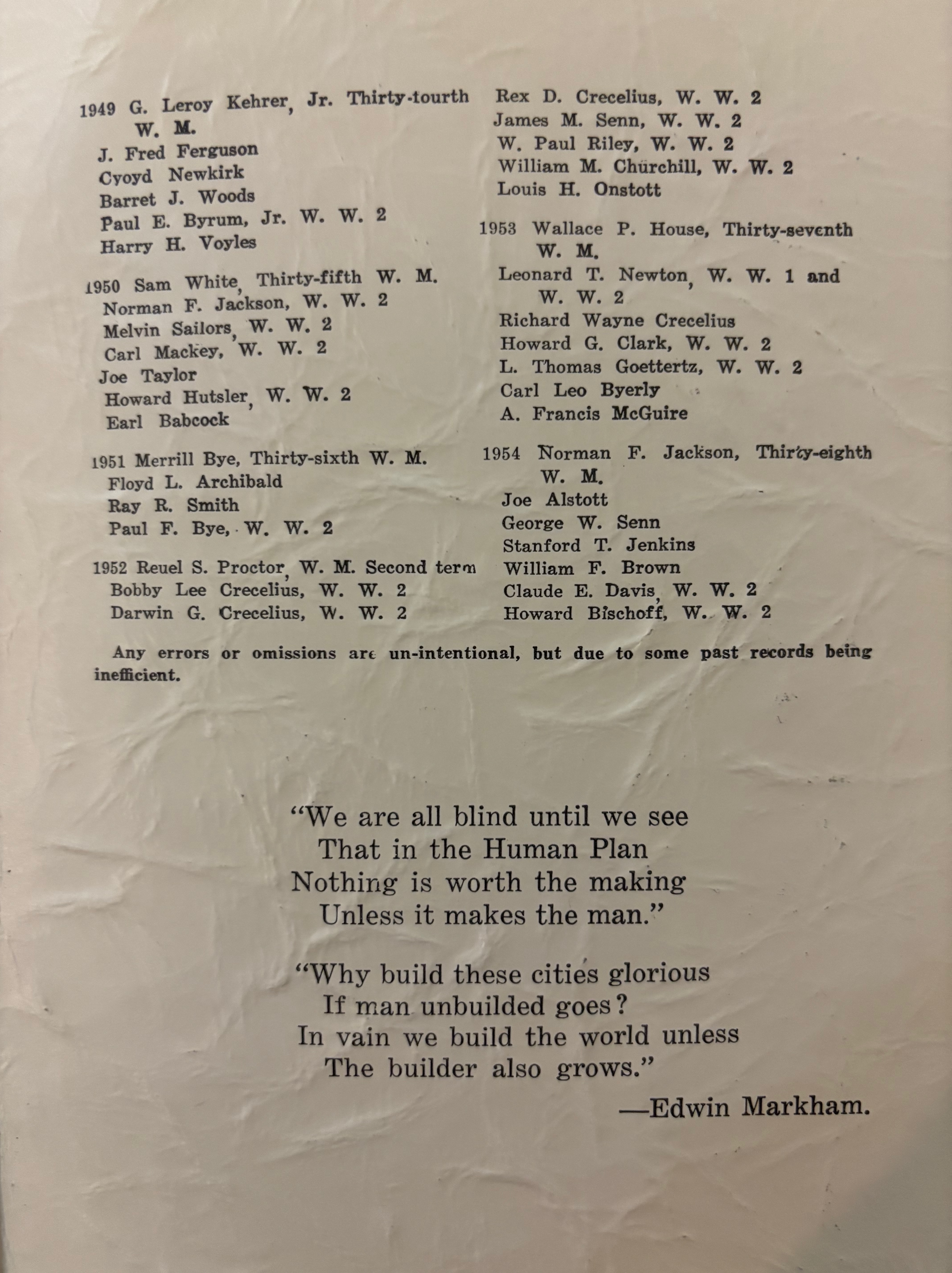 By-law committee of 1939: Albert Judd, Willard Jones, W.W. Dooley. By-laws were adopted on Friday, February 10, 1939. Fred Ferguson, Fin.-Sec; Vincent Newkirk, N.C. By-laws examined and approved by Fred Major, D.G.M. (*taken from the by-laws book pictured below)