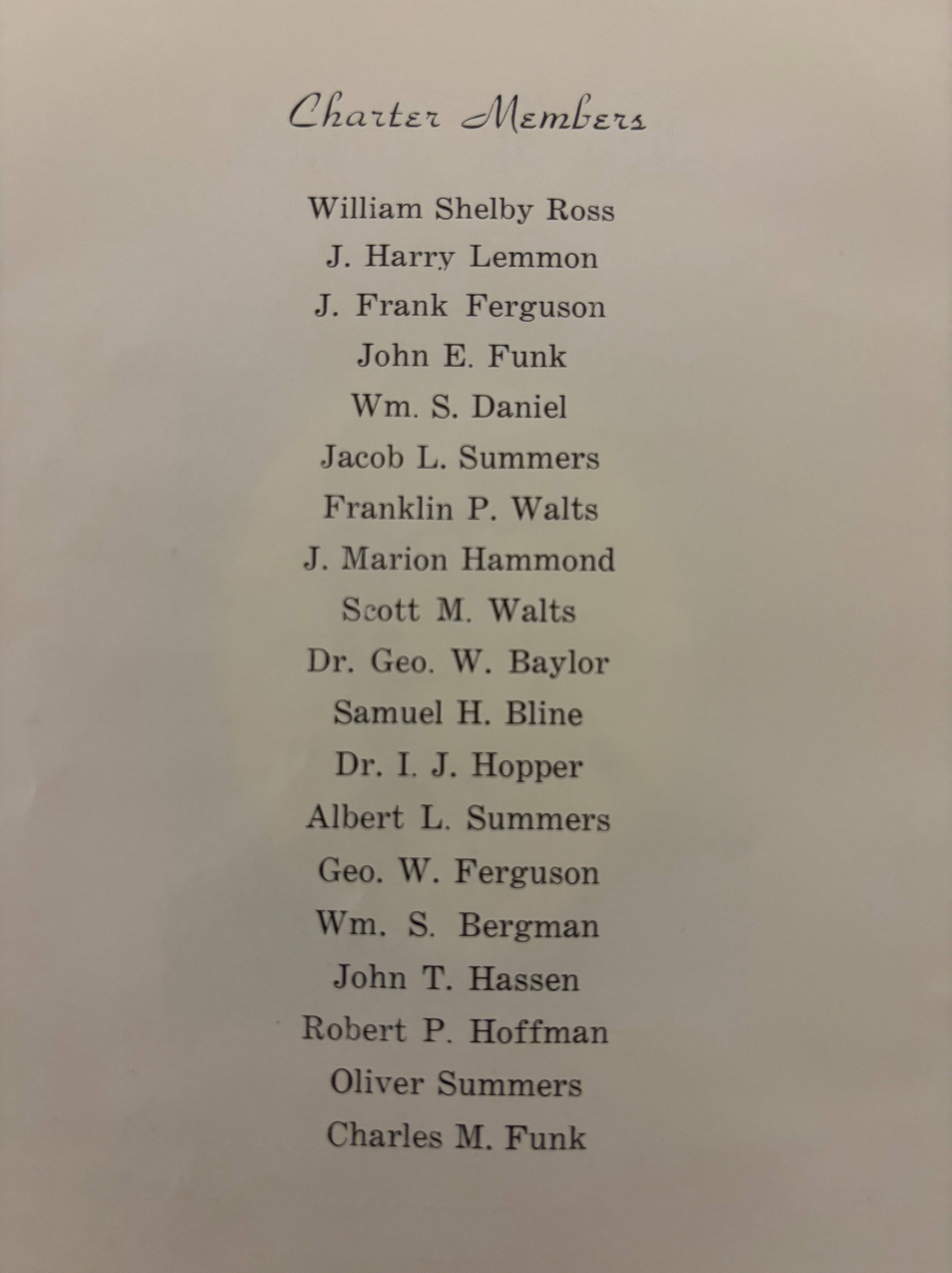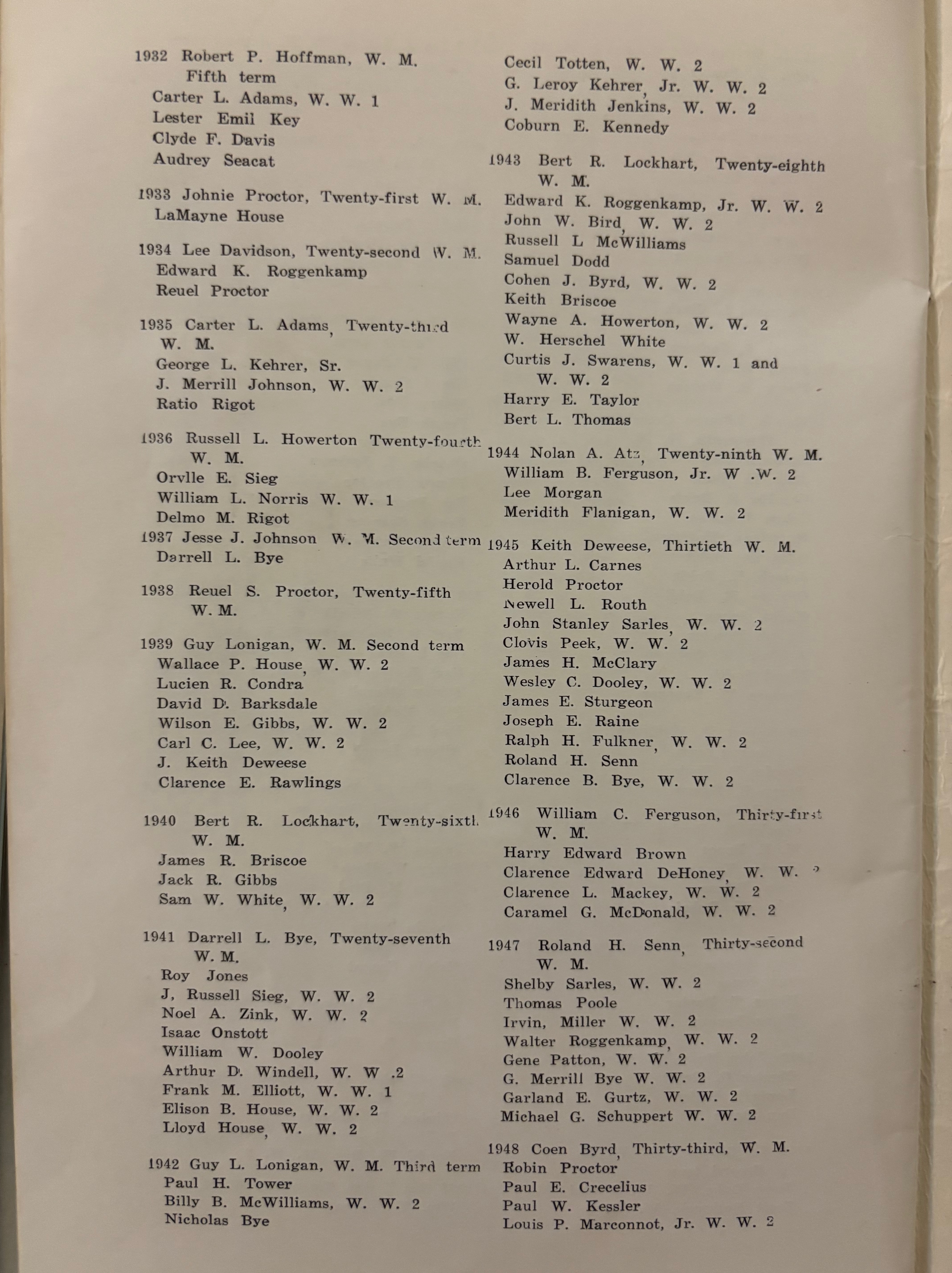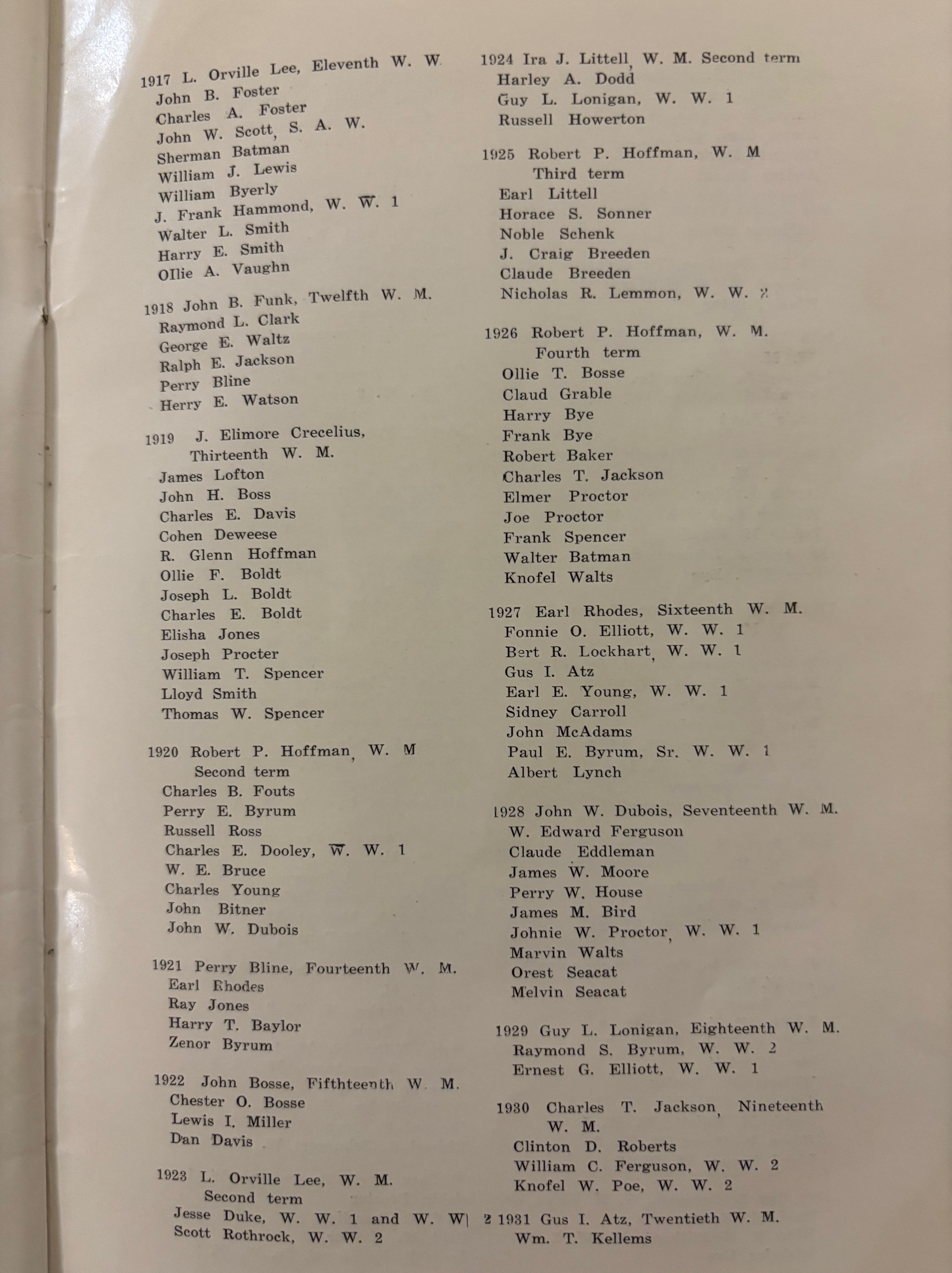G.W. Funk, W.M. Rhode, C.W. Rawling, J. Summers, G.W. Baylor, Robin Proctor, J.M. Hammon, J.E. Dorley, W.M. Poe, F.K. Moon, C.A. Trotter, Ed Moon, J.W. Pennington, W. Flanigan, J.E. Funk and Fred Patterson. (“Milltown – A Community History” – Jeffrey David & William Brockman)